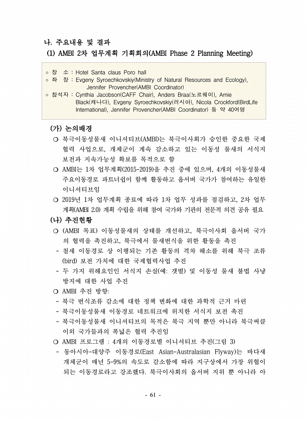 61 나. 주요내용 및 결과 1 AMBI 2차 업무계획 기획회의 AMBI Phase 2 Planning Meeting ? 장 소 Hotel Santa claus Poro hall ? 좌 장 Evgeny Syroechkovskiy Ministry of Natural Resources and Ecology , Jennifer Provencher AMBI Coordinator ? 참석자 Cynthia Jacobson CAFF Chair , Anders Braa 노르웨이 , Amie Black 캐나다 , Evgeny Syroechkovskiy 러시아 , Nicola Crockford BirdLife International , Jennifer Provencher AMBI Coordinator 등 약 40여명 가 논...