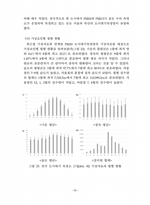 53 비해 매우 적었다 전국적으로 한 도시에서 과 가 같은 수의 측정 소가 운영되며 측정되고 있는 곳은 서울과 부산의 도시대기측정망이 유일하 였다 나 기상요인별 월별 현황 최근접 기상자료와 연계된 도시대기측정망의 기상자료를 대상으로 기상요인별 월별 현황을 살펴보았다 그림 기온의 월평균은 월에 최저 영 하 에서 월에 최고 로 분포하였다 풍속의 월평균은 월에 최저 에서 월에 최고 로 분포하여 월별 평균 차이가 작았다 그러나 평균의 표준편차가 큰 편이어서 풍속의 변화량이 크다는 것을 알 수 있었다 습도의 월평균은 월에 최저 에서 월에 최고 로 분포하였다 여름 철인 월 습도가 높았고 겨울철과 봄철에 걸쳐 습도가 낮았다 월별 강수량 의 합계는 월에 최저 에서 월에 최고 로 분포하였다 겨 울철인 월의 강수량이 작았고 ...