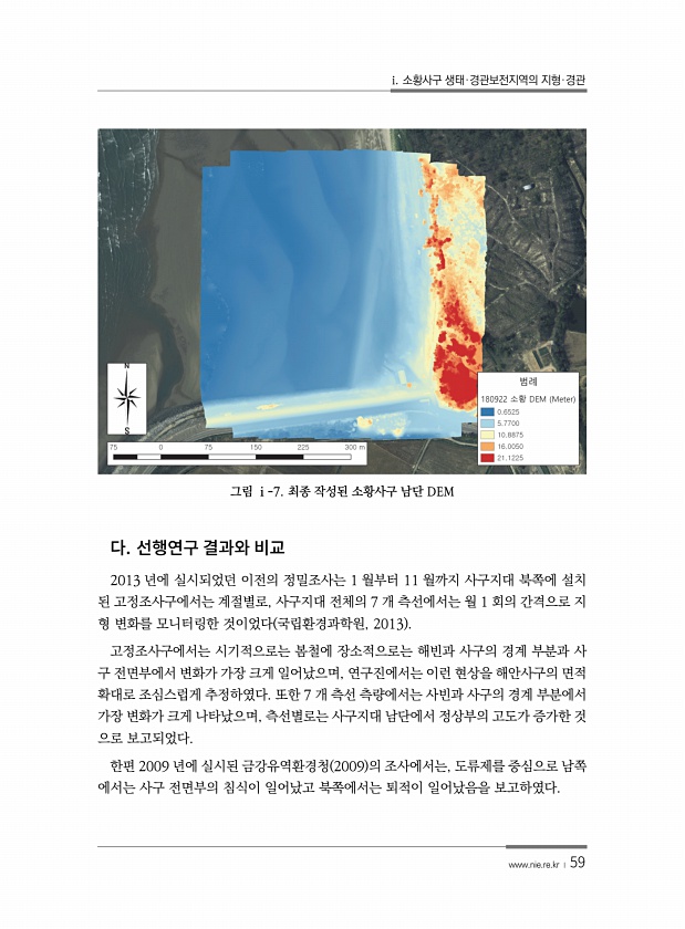 i. 소황사구 생태·경관보전지역의 지형·경관 www.nie.re.kr ? 59 그림 ⅰ-7. 최종 작성된 소황사구 남단 DEM 2013 년에 실시되었던 이전의 정밀조사는 1 월부터 11 월까지 사구지대 북쪽에 설치 된 고정조사구에서는 계절별로, 사구지대 전체의 7 개 측선에서는 월 1 회의 간격으로 지 형 변화를 모니터링한 것이었다 국립환경과학원, 2013 고정조사구에서는 시기적으로는 봄철에 장소적으로는 해빈과 사구의 경계 부분과 사 구 전면부에서 변화가 가장 크게 일어났으며, 연구진에서는 이런 현상을 해안사구의 면적 확대로 조심스럽게 추정하였다. 또한 7 개 측선 측량에서는 사빈과 사구의 경계 부분에서 가장 변화가 크게 나타났으며, 측선별로는 사구지대 남단에서 정상부의 고도가 증가한 것 으로 보고되었다. ...