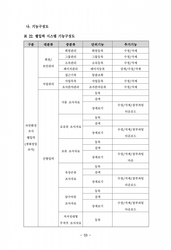 59 나. 기능구성도 구분 대분류 중분류 단위기능 추가기능 자연환경 조사 웹입력 생태정밀 조사 회원/ 보안관리 회원관리 회원등록 수정/삭제 그룹관리 그룹등록 수정/삭제 소속관리 소속등록 수정/삭제 페이지관리 페이지등록 상세/수정/삭제 접근기록 일괄조회 사업관리 사업목록 사업등록 수정/삭제 조사분야관리 조사분야등록 수정/삭제 건별입력 식물 조사자료 등록 검색 상세보기 수정/삭제/첨부파일 다운로드 포유류 조사자료 등록 검색 상세보기 수정/삭제/첨부파일 다운로드 조류 조사자료 등록 검색 상세보기 수정/삭제/첨부파일 다운 육상곤충 조사자료 등록 검색 상세보기 수정/삭제/첨부파일 다운로드 담수어류 조사자료 등록 검색 상세보기 수정/삭제/첨부파일 다운로드 저서성대형 무척추 조사자료 등록 표 22. 웹입력 시스템기능구성...
