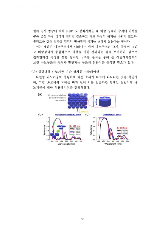 50 빛의 입사 방향에 대해 090°로 변화시켰을 때 배향 상태가 수직에 가까울 수록 중심 파장 영역의 세기만 감소하고 피크 파장의 위치는 바뀌지 않았다. 흥미로운 점은 장파장 영역의 반사광의 세기는 변하지 않는다는 점이다. 이는 케라틴 나노구조에서 나타나는 색이 나노구조의 크기, 종횡비 그리 고 배향상태가 종합적으로 영향을 미친 결과라는 점을 보여준다. 앞으로 전자현미경 측정을 통한 삼차원 구조를 분석을 통해 본 시뮬레이션에서 보인 나노구조의 특징과 발현되는 구조의 연관성을 분석할 필요가 있다. 다 실린더형 나노기공 기반 삼차원 시뮬레이션 타원형 나노기공의 종횡비에 따른 효과가 다르게 나타나는 것을 확인하 여, 그림 56 a 에서 보이는 바와 같이 이를 단순화한 형태인 실린더형 나 노기공에 대한 시뮬레이션...