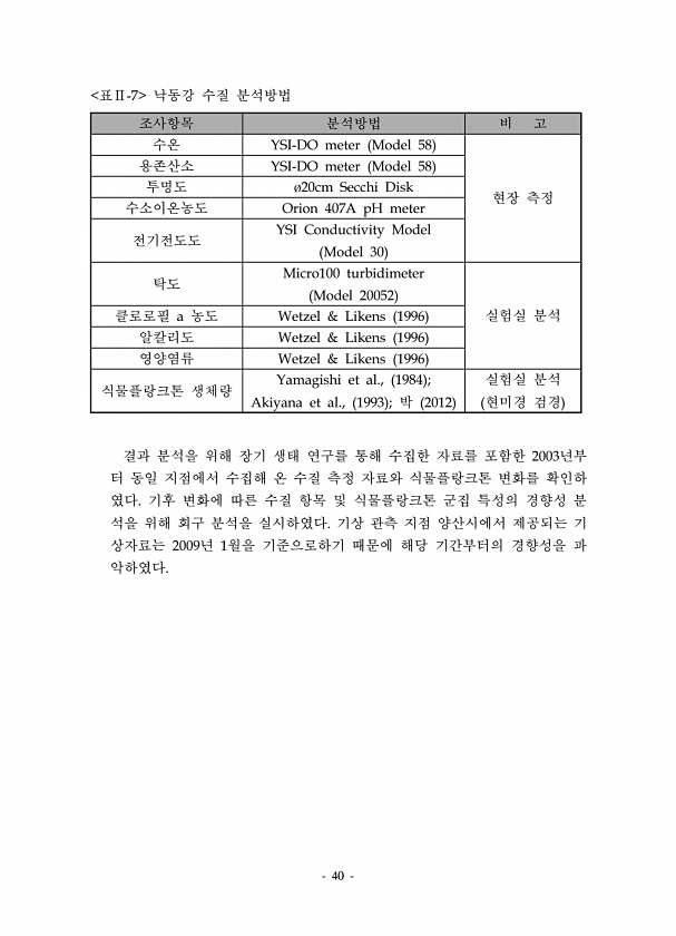 40 조사항목 분석방법 비 고 수온 YSI-DO meter Model 58 현장 측정 용존산소 YSI-DO meter Model 58 투명도 ø20cm Secchi Disk 수소이온농도 Orion 407A pH meter 전기전도도 YSI Conductivity Model Model 30 탁도 Micro100 turbidimeter Model 20052 클로로필 a 농도 Wetzel & Likens 1996 실험실 분석 알칼리도 Wetzel & Likens 1996 영양염류 Wetzel & Likens 1996 식물플랑크톤 생체량 Yamagishi et al., 1984 ; Akiyana et al., 1993 ; 박 2012 실험실 분석 현미경 검경 표Ⅱ-7 낙동강 수질 분석방법 결과 분석을 위해 장기 생...