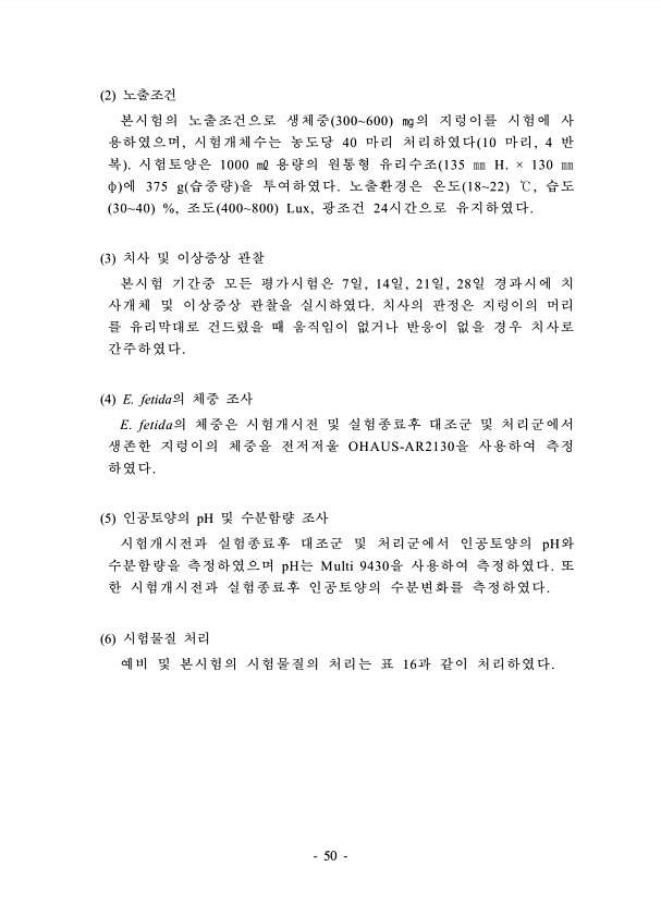 50 2 노출조건 본시험의 노출조건으로 생체중 300600 ㎎의 지렁이를 시험에 사 용하였으며, 시험개체수는 농도당 40 마리 처리하였다 10 마리, 4 반 복 시험토양은 1000 ㎖ 용량의 원통형 유리수조 135 ㎜ H. × 130 ㎜ φ 에 375 g 습중량 을 투여하였다. 노출환경은 온도 1822 ℃, 습도 3040 %, 조도 400800 Lux, 광조건 24시간으로 유지하였다. 3 치사 및 이상증상 관찰 본시험 기간중 모든 평가시험은 7일, 14일, 21일, 28일 경과시에 치 사개체 및 이상증상 관찰을 실시하였다. 치사의 판정은 지렁이의 머리 를 유리막대로 건드렸을 때 움직임이 없거나 반응이 없을 경우 치사로 간주하였다. 4 E. fetida의 체중 조사 E. fetida의 체중은 시험개시전 및 실...