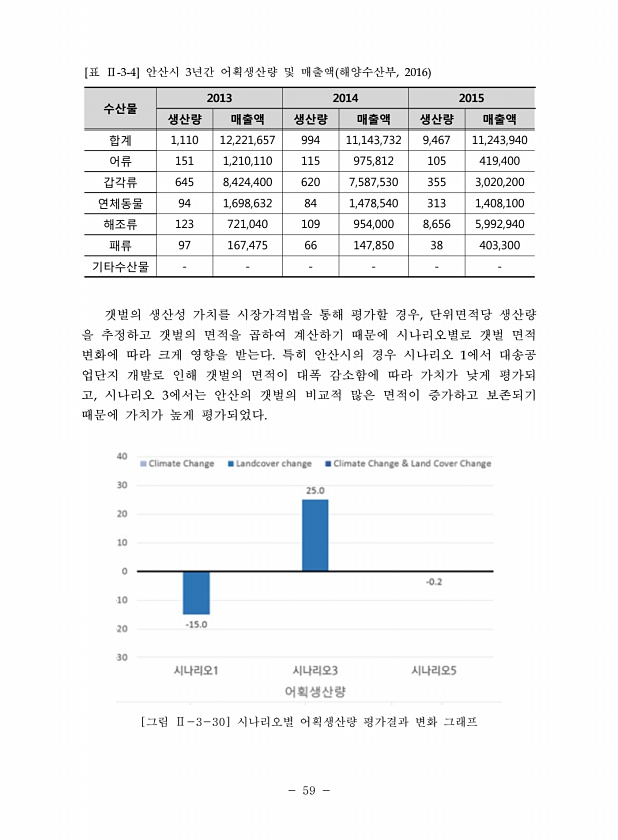 59 수산물 2013 2014 2015 생산량 매출액 생산량 매출액 생산량 매출액 합계 1,110 12,221,657 994 11,143,732 9,467 11,243,940 어류 151 1,210,110 115 975,812 105 419,400 갑각류 645 8,424,400 620 7,587,530 355 3,020,200 연체동물 94 1,698,632 84 1,478,540 313 1,408,100 해조류 123 721,040 109 954,000 8,656 5,992,940 패류 97 167,475 66 147,850 38 403,300 기타수산물 [표 Ⅱ-3-4] 안산시 3년간 어획생산량 및 매출액 해양수산부, 2016 갯벌의 생산성 가치를 시장가격법을 통해 평가할 경우, 단위면적당 생산량 을 ...