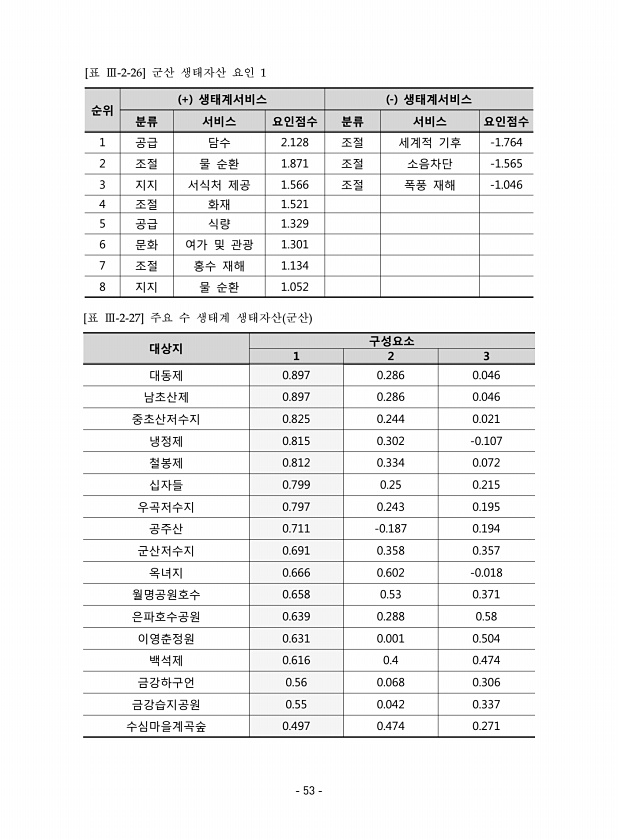 순위 + 생태계서비스 생태계서비스 분류 서비스 요인점수 분류 서비스 요인점수 1 공급 담수 2.128 조절 세계적 기후 -1.764 2 조절 물 순환 1.871 조절 소음차단 -1.565 3 지지 서식처 제공 1.566 조절 폭풍 재해 -1.046 4 조절 화재 1.521 5 공급 식량 1.329 6 문화 여가 및 관광 1.301 7 조절 홍수 재해 1.134 8 지지 물 순환 1.052 [표 Ⅲ-2-26] 군산 생태자산 요인 1 대상지 구성요소 1 2 3 대동제 0.897 0.286 0.046 남초산제 0.897 0.286 0.046 중초산저수지 0.825 0.244 0.021 냉정제 0.815 0.302 -0.107 철봉제 0.812 0.334 0.072 십자들 0.799 0.25 0.215 우곡저수지 ...