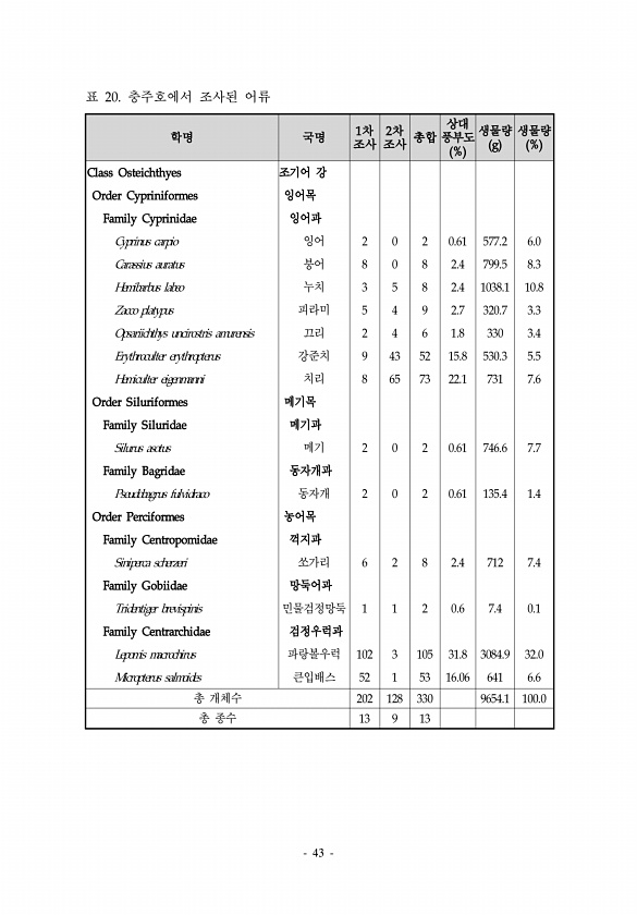 43 학명 국명 1차 조사 2차 조사 총합 상대 풍부도 % 생물량 g 생물량 % Class Osteichthyes 조기어 강 Order Cypriniformes 잉어목 Family Cyprinidae 잉어과 Cyprinus carpio 잉어 2 0 2 0.61 577.2 6.0 Carassius auratus 붕어 8 0 8 2.4 799.5 8.3 Hemibarbus labeo 누치 3 5 8 2.4 1038.1 10.8 Zacco platypus 피라미 5 4 9 2.7 320.7 3.3 Opsariichthys uncirostris amurensis 끄리 2 4 6 1.8 330 3.4 Erythroculter erythropterus 강준치 9 43 52 15.8 530.3 5.5 Hemiculter...