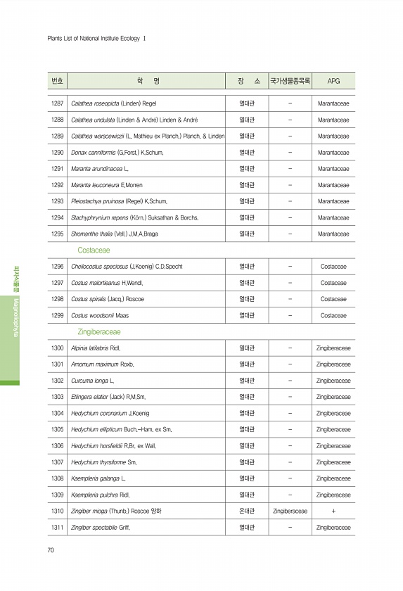 70 번호 학 명 장 소 국가생물종목록 APG 피자식물문 Magnoliophyta Plants List of National Institute Ecology Ⅰ 1287 Calathea roseopicta Linden Regel 열대관 Marantaceae 1288 Calathea undulata Linden & Andr? Linden & Andr? 열대관 Marantaceae 1289 Calathea warscewiczii L. Mathieu ex Planch. Planch. & Linden 열대관 Marantaceae 1290 Donax canniformis G.Forst. K.Schum. 열대관 Marantaceae 1291 Maranta arundinacea L. 열대관 Marantaceae 1292...