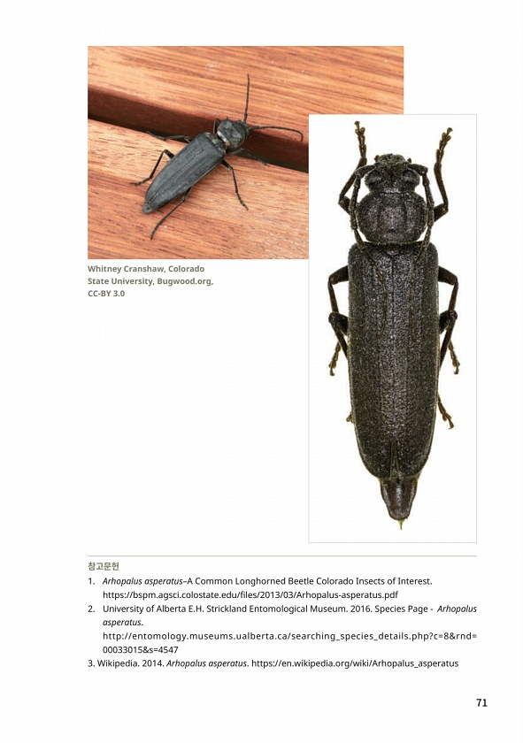 71 참고문헌 1. Arhopalus asperatus?A Common Longhorned Beetle Colorado Insects of Interest. https//bspm.agsci.colostate.edu/files/2013/03/Arhopalus-asperatus.pdf 2. University of Alberta E.H. Strickland Entomological Museum. 2016. Species Page Arhopalus asperatus. http//entomology.museums.ualberta.ca/searching_species_details.php?c=8&rnd= 00033015&s=4547 3. Wikipedia. 2014. Arhopalus asperatus. https/...