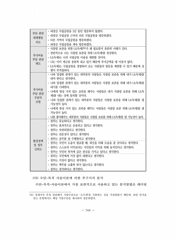 709 부단 관련 대체행동 의도 내장산 국립공원을 1년 동안 방문하지 않겠다. 내장산 국립공원 근처의 다른 국립공원을 방문하겠다. 다른 지역의 국립공원을 방문하겠다. 내장산 국립공원을 계속 방문하겠다. 추가비용 부담 관련 태도 사찰림 보존을 위한 소득세 78 가 왜 필요한지 충분히 이해가 간다. 전반적으로 나는 사찰림 보존을 위한 소득세 를 찬성한다. 소득세 는 나의 국립공원 이용을 제한할 것이다. 나는 이미 세금을 충분히 내고 있기 때문에 추가금액을 낼 이유가 없다. 소득세 는 국립공원을 경험하러 오는 사람들의 방문을 제한할 수 있기 때문에 실 행이 부적절하다. 추가비용 부담 관련 주관적 규범 나와 밀접한 관계가 있는 대부분의 사람들은 사찰림 보존을 위해 내가 소득세 를 내야 한다고 생각한다. 나와 밀접한...