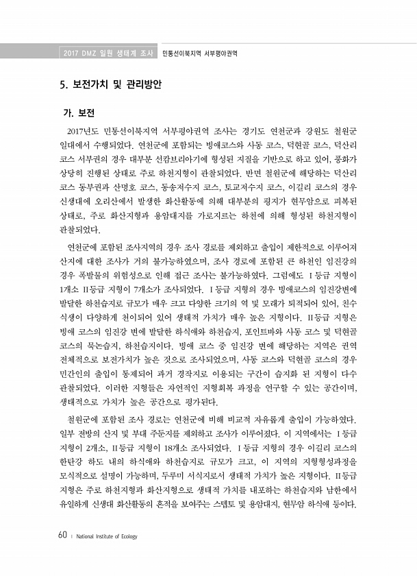 2017 DMZ 일원 생태계 조사 민통선이북지역 서부평야권역 60 ? National Institute of Ecology 5. 보전가치 및 관리방안 가. 보전 2017년도 민통선이북지역 서부평야권역 조사는 경기도 연천군과 강원도 철원군 일대에서 수행되었다. 연천군에 포함되는 빙애코스와 사동 코스, 덕현골 코스, 덕산리 코스 서부권의 경우 대부분 선캄브리아기에 형성된 지질을 기반으로 하고 있어, 풍화가 상당히 진행된 상태로 주로 하천지형이 관찰되었다. 반면 철원군에 해당하는 덕산리 코스 동부권과 산명호 코스, 동송저수지 코스, 토교저수지 코스, 이길리 코스의 경우 신생대에 오리산에서 발생한 화산활동에 의해 대부분의 평지가 현무암으로 피복된 상태로, 주로 화산지형과 용암대지를 가로지르는 하천에 의해 형성된 하...