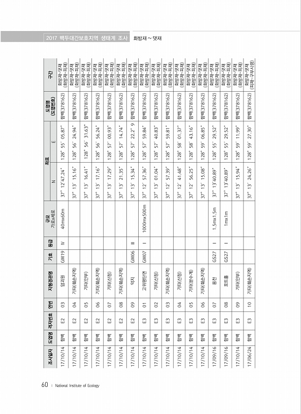 60 조사일자 도엽명 격자번호 연번 지형경관명 기호 등급 규모 가로x세로 좌표 도엽명 N E 도엽번호 구간 17/10/14 함백 E2 03 암괴원 GM19 Ⅳ 40mx60m 37°12’47.24″ 128°55′05.87″ 함백 378162 화방재댓재 화방재피재 17/10/14 함백 E2 04 기타 훼손지역 37°13′15.16″ 128°56′24.94″ 함백 378162 화방재댓재 화방재피재 17/10/14 함백 E2 05 기타 안부 37°13′16.41″ 128°56′31.63“ 함백 378162 화방재댓재 화방재피재 17/10/14 함백 E2 06 기타 훼손지역 37°13′17.16″ 128°56′56.24″ 함백 378162 화방재댓재 화방재피재 17/10/14 함백 E2 07 기타 산정 37°13′1...