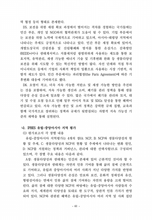 력 협정 등의 형태로 존재한다. D5. 보전을 위한 재원 확보 과정에서 벌어지는 격차를 경험하는 국가들에는 민간 부문, 개인 및 NGO와의 협력관계가 도움이 될 수 있다. 기업 부문에서 는 보전을 위한 노력에 국제적으로 기여하고 있으며, 아시아-태평양 지역에서 나타나는 추세도 긍정적으로 나타나고 있다. 민간 부문 재정 확보에 있어서, 개발도상국의 산림전용 및 산림황폐화 방지를 통한 온실가스 감축방안 REDD+ 이나 생태계서비스 지불제처럼 광범위하게 사용되는 제도를 통한 보 호지역, 유역관리, 재생 가능한 에너지 기술 및 기후변화 완화 등 생물다양성 보전을 위해 시도할 수 있는 혁신적인 방법이 많다. 자선 단체와 직접 투자 이니셔티브 등에서 기업의 사회적 책임의 일환으로 사용하는 시장 기반적, 자 발적 제도가...