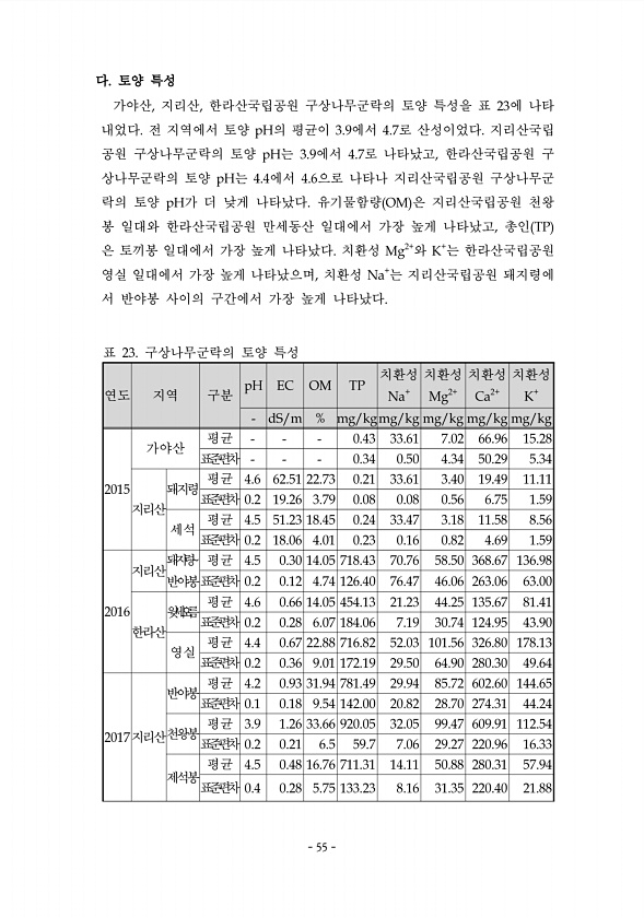 55 다. 토양 특성 가야산, 지리산, 한라산국립공원 구상나무군락의 토양 특성을 표 23에 나타 내었다. 전 지역에서 토양 pH의 평균이 3.9에서 4.7로 산성이었다. 지리산국립 공원 구상나무군락의 토양 pH는 3.9에서 4.7로 나타났고, 한라산국립공원 구 상나무군락의 토양 pH는 4.4에서 4.6으로 나타나 지리산국립공원 구상나무군 락의 토양 pH가 더 낮게 나타났다. 유기물함량 OM 은 지리산국립공원 천왕 봉 일대와 한라산국립공원 만세동산 일대에서 가장 높게 나타났고, 총인 TP 은 토끼봉 일대에서 가장 높게 나타났다. 치환성 Mg2+와 K+는 한라산국립공원 영실 일대에서 가장 높게 나타났으며, 치환성 Na+는 지리산국립공원 돼지령에 서 반야봉 사이의 구간에서 가장 높게 나타났다. 연도 지역 구분 p...