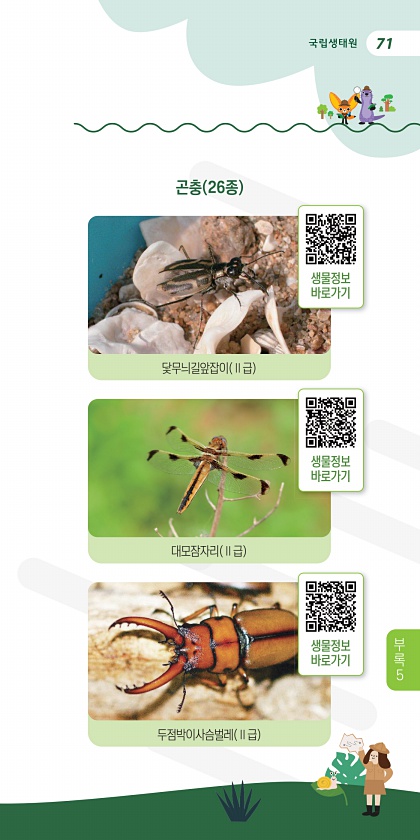 71 곤충 26종 닻무늬길앞잡이 Ⅱ급 대모잠자리 Ⅱ급 두점박이사슴벌레 Ⅱ급 생물정보 바로가기 생물정보 바로가기 생물정보 바로가기 부 록5