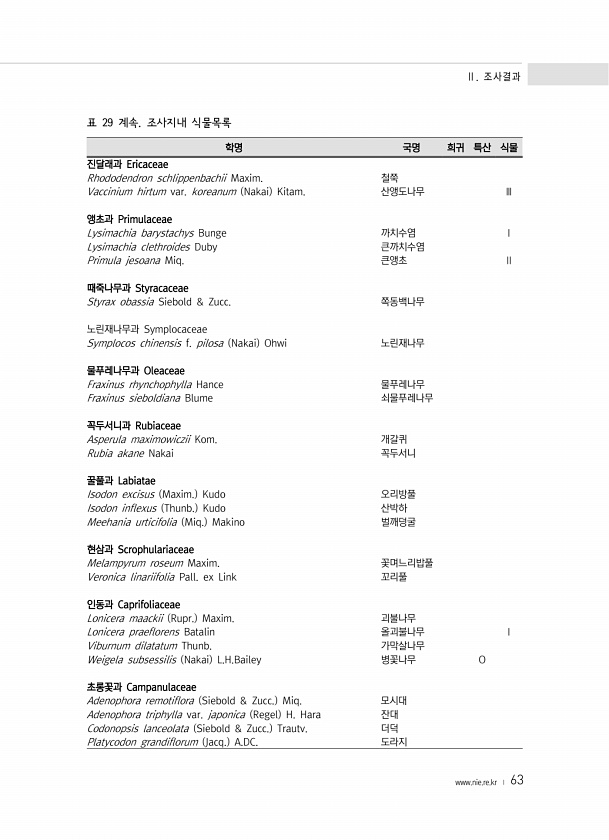 Ⅱ. 조사결과 www.nie.re.kr ? 63 학명 국명 희귀 특산 식물 진달래과 Ericaceae Rhododendron schlippenbachii Maxim. 철쭉 Vaccinium hirtum var. koreanum Nakai Kitam. 산앵도나무 Ⅲ 앵초과 Primulaceae Lysimachia barystachys Bunge 까치수염 Ⅰ Lysimachia clethroides Duby 큰까치수염 Primula jesoana Miq. 큰앵초 Ⅱ 때죽나무과 Styracaceae Styrax obassia Siebold & Zucc. 쪽동백나무 노린재나무과 Symplocaceae Symplocos chinensis f. pilosa Nakai Ohwi 노린재나무 물푸레나무과 Oleaceae F...