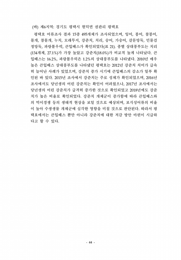 44 바 제6지역경기도 평택시 현덕면 권관리 평택호 평택호 어류조사 결과 15종 495개체가 조사되었으며, 잉어, 붕어, 참붕어, 몰개, 참몰개, 누치, 모래무지, 강준치, 치리, 숭어, 가숭어, 갈문망둑, 민물검 정망둑, 파랑볼우럭, 큰입배스가 확인되었다 표 21 종별 상대풍부도는 치리 134개체, 27.1% 가 가장 높았고 강준치 18.0% 가 비교적 높게 나타났다. 큰 입배스는 16.2%, 파랑볼우럭은 1.2%의 상대풍부도를 나타냈다. 2010년 매우 높은 큰입배스 상대풍부도를 나타냈던 평택호는 2012년 강준치 치어가 급속 히 늘어난 사례가 있었으며, 강준치 증가 시기에 큰입배스의 감소가 일부 확 인된 바 있다. 2015년 조사에서 강준치는 주로 성체가 확인되었으며, 2016년 조사에서도 당년생의 어...