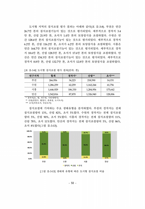 50 도시형 지역의 침식조절 평가 결과는 아래와 같다 표 Ⅱ-3-8 부천은 연간 26.7만 톤의 침식조절기능이 있는 것으로 평가되었다. 세부적으로 경작지 3.4 만 톤, 산림 21.9만 톤, 초지가 1.4만 톤의 토양침식을 조절하였다. 수원은 연 간 128.6만 톤의 침식조절기능이 있는 것으로 평가되었다. 세부적으로 경작지 6.2만 톤, 산림 116.2만 톤, 초지가 6.2만 톤의 토양침식을 조절하였다. 시흥은 연간 164.7만 톤의 침식조절기능이 있는 것으로 평가되었다. 세부적으로 경작 지 18.6만 톤, 산림 128.5만 톤, 초지가 17.6만 톤의 토양침식을 조절하였다. 안 산은 연간 154.3만 톤의 침식조절기능이 있는 것으로 평가되었다. 세부적으로 경작지 8.8만 톤, 산림 132.7만 톤, 초지가...