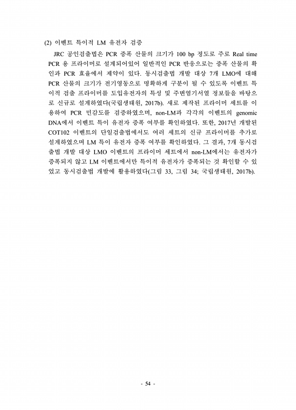 54 2 이벤트 특이적 LM 유전자 검증 JRC 공인검출법은 PCR 증폭 산물의 크기가 100 bp 정도로 주로 Real time PCR 용 프라이머로 설계되어있어 일반적인 PCR 반응으로는 증폭 산물의 확 인과 PCR 효율에서 제약이 있다. 동시검출법 개발 대상 7개 LMO에 대해 PCR 산물의 크기가 전기영동으로 명확하게 구분이 될 수 있도록 이벤트 특 이적 검출 프라이머를 도입유전자의 특성 및 주변염기서열 정보들을 바탕으 로 신규로 설계하였다 국립생태원, 2017b 새로 제작된 프라이머 세트를 이 용하여 PCR 민감도를 검증하였으며, non-LM과 각각의 이벤트의 genomic DNA에서 이벤트 특이 유전자 증폭 여부를 확인하였다. 또한, 2017년 개발된 COT102 이벤트의 단일검출법에서도 여러 세...