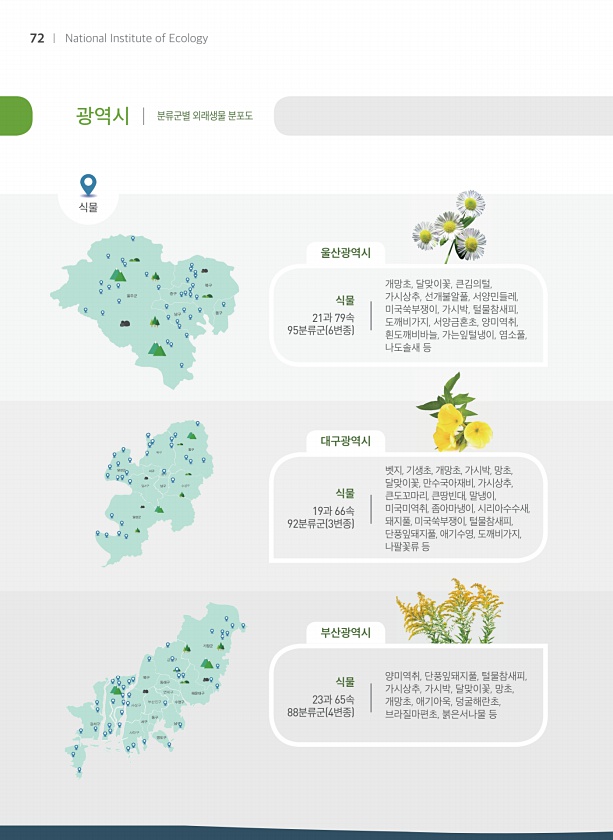 광역시 분류군별 외래생물 분포도 동구 북구 서구 달서구 남구 달성군 달성군 수성구 울주군 중구 북구 남구 동구 식물 21과 79속 95분류군 6변종 식물 23과 65속 88분류군 4변종 식물 19과 66속 92분류군 3변종 개망초, 달맞이꽃, 큰김의털, 가시상추, 선개불알풀, 서양민들레, 미국쑥부쟁이, 가시박, 털물참새피, 도깨비가지, 서양금혼초, 양미역취, 흰도깨비바늘, 가는잎털냉이, 염소풀, 나도솔새 등 양미역취, 단풍잎돼지풀, 털물참새피, 가시상추, 가시박, 달맞이꽃, 망초, 개망초, 애기아욱, 덩굴해란초, 브라질마편초, 붉은서나물 등 벳지, 기생초, 개망초, 가시박, 망초, 달맞이꽃, 만수국아재비, 가시상추, 큰도꼬마리, 큰땅빈대, 말냉이, 미국미역취, 좀아마냉이, 시리아수수새, 돼지풀, 미국쑥부쟁이...