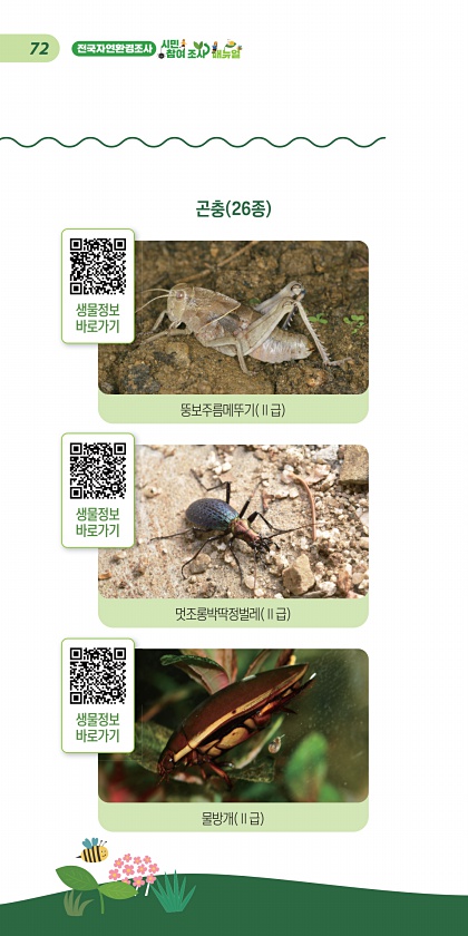 72 곤충 26종 뚱보주름메뚜기 Ⅱ급 멋조롱박딱정벌레 Ⅱ급 물방개 Ⅱ급 생물정보 바로가기 생물정보 바로가기 생물정보바로가기