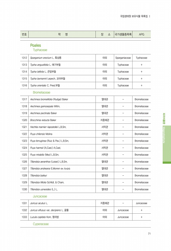 71 번호 학 명 장 소 국가생물종목록 APG 피자식물문 Magnoliophyta 국립생태원 보유식물 목록집 Ⅰ Poales Typhaceae 1312 Sparganium erectum L. 흑삼릉 야외 Sparganiaceae Typhaceae 1313 Typha angustifolia L. 애기부들 야외 Typhaceae + 1314 Typha latifolia L. 큰잎부들 야외 Typhaceae + 1315 Typha laxmannii Lepech. 꼬마부들 야외 Typhaceae + 1316 Typha orientalis C. Presl.부들 야외 Typhaceae + Bromeliaceae 1317 Aechmea bromeliifolia Rudge Baker 열대관 Bromeliaceae 1318...