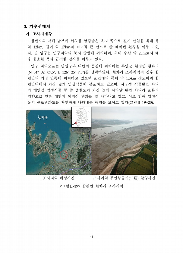 41 3. 기수생태계 가. 조사지개황 한반도의 서해 남부에 위치한 함평만은 육지 쪽으로 길게 만입한 최대 폭 약 12km, 길이 약 17km의 비교적 큰 만으로 반 폐쇄된 환경을 이루고 있 다. 만 입구는 연구지역의 북서 방향에 위치하며, 최대 수심 약 23m로서 매 우 협소한 폭과 급격한 경사를 이루고 있다. 연구 지역으로는 만입구와 내만의 중심에 위치하는 무안군 현경면 현화리 N 34° 0207.5, E 126° 257.5를 선택하였다. 현화리 조사지역의 경우 함 평만의 가장 안쪽에 위치하고 있으며 조간대의 폭이 약 1.5km 정도이며 함 평만내에서 가장 넓게 염생식물이 분포하고 있으며, 사구성 식물뿐만 아니 라 해안성 염생식물 등 종 출현도가 가장 높게 나타날 뿐만 아니라 조류의 영향으로 인한 해안의 ...