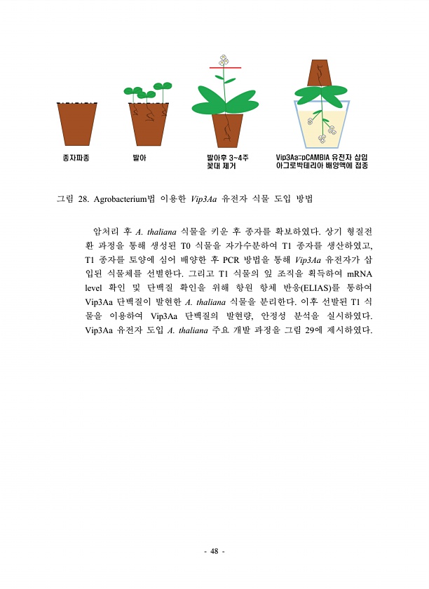48 그림 28. Agrobacterium법 이용한 Vip3Aa 유전자 식물 도입 방법 암처리 후 A. thaliana 식물을 키운 후 종자를 확보하였다. 상기 형질전 환 과정을 통해 생성된 T0 식물을 자가수분하여 T1 종자를 생산하였고, T1 종자를 토양에 심어 배양한 후 PCR 방법을 통해 Vip3Aa 유전자가 삽 입된 식물체를 선별한다. 그리고 T1 식물의 잎 조직을 획득하여 mRNA level 확인 및 단백질 확인을 위해 항원 항체 반응 ELIAS 를 통하여 Vip3Aa 단백질이 발현한 A. thaliana 식물을 분리한다. 이후 선발된 T1 식 물을 이용하여 Vip3Aa 단백질의 발현량, 안정성 분석을 실시하였다. Vip3Aa 유전자 도입 A. thaliana 주요 개발 과정을 그림 29에제시하였...