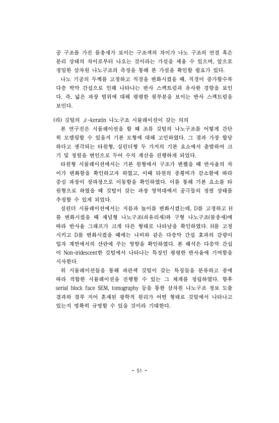 51 공 구조를 가진 물총새가 보이는 구조색의 차이가 나노 구조의 연결 혹은 분리 상태의 차이로부터 나오는 것이라는 가설을 세울 수 있으며, 앞으로 정밀한 삼차원 나노구조의 측정을 통해 본 가설을 확인할 필요가 있다. 나노 기공의 두께를 고정하고 직경을 변화시켰을 때, 직경이 증가할수록 다층 박막 간섭으로 인해 나타나는 반사 스펙트럼과 유사한 경향을 보인 다. 즉, 넓은 파장 범위에 대해 평평한 윗부분을 보이는 반사 스펙트럼을 보인다. 라 깃털의 β-keratin 나노구조 시뮬레이션이 갖는 의의 본 연구진은 시뮬레이션을 할 때 조류 깃털의 나노구조를 어떻게 간단 히 모델링할 수 있을지 기본 모형에 대해 고민하였다. 그 결과 가장 합당 하다고 생각되는 타원형, 실린더형 두 가지의 기본 요소에서 출발하여 크 기...