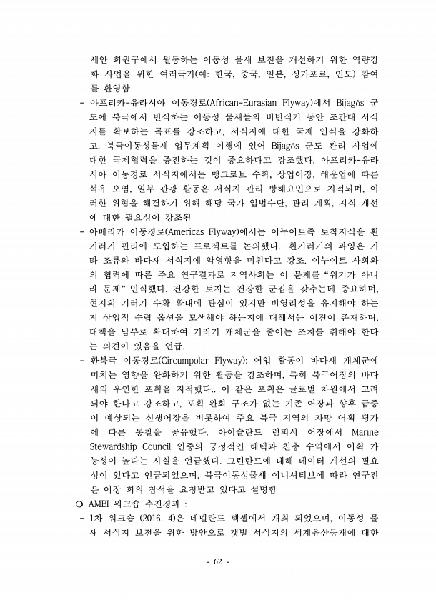 62 세안 회원구에서 월동하는 이동성 물새 보전을 개선하기 위한 역량강 화 사업을 위한 여러국가 예한국, 중국, 일본, 싱가포르, 인도 참여 를 환영함 아프리카-유라시아 이동경로 African-Eurasian Flyway 에서 Bijag?s 군 도에 북극에서 번식하는 이동성 물새들의 비번식기 동안 조간대 서식 지를 확보하는 목표를 강조하고, 서식지에 대한 국제 인식을 강화하 고, 북극이동성물새 업무계획 이행에 있어 Bijag?s 군도 관리 사업에 대한 국제협력을 증진하는 것이 중요하다고 강조했다. 아프리카-유라 시아 이동경로 서식지에서는 맹그로브 수확, 상업어장, 해운업에 따른 석유 오염, 일부 관광 활동은 서식지 관리 방해요인으로 지적되며, 이 러한 위협을 해결하기 위해 해당 국가 입법수단, 관리 계획, ...