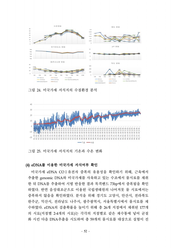 52 그림 24. 미국가재 서식지의 수질환경 분석 그림 25. 미국가재 서식지의 기온과 수온 변화 4 eDNA를 이용한 미국가재 서식여부 확인 미국가재 eDNA COⅠ유전자 증폭의 유용성을 확인하기 위해, 근육에서 추출한 genomic DNA와 미국가재를 사육하고 있는 수조에서 물시료를 채취 한 뒤 DNA를 추출하여 시범 반응한 결과 목격밴드 73bp에서 증폭됨을 확인 하였다. 반면 음성대조군으로 이용된 국립생태원의 나어저못 물 시료에서는 증폭하지 않음을 확인하였다. 분석을 위해 경기도 고양시, 안산시, 전라북도 완주군, 익산시, 전라남도 나주시, 광주광역시, 서울특별시에서 물시료를 채 수하였다. eDNA의 검출확률을 높이기 위해 총 26개 지점에서 채취된 177개 의 시료 지점별 2-4개의 시료 는 각각의...