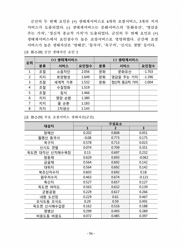 군산의 두 번째 요인은 + 생태계서비스로 4개의 조절서비스, 3개의 지지 서비스가 도출되었다. 생태계서비스는 문화서비스의 ‘문화유산’, ‘영감을 주는 가치’, ‘정신적 종교적 가치’가 도출되었다. 군산의 두 번째 요인은 + 생태계서비스에서 요인점수가 높은 조절서비스로 명명하였다. 군산에 조절 서비스가 높은 생태자산은 ‘망해산’, ‘동국사’, ‘옥구지’, ‘신시도 갯벌’ 등이다. 순위 + 생태계서비스 생태계서비스 분류 서비스 요인점수 분류 서비스 요인점수 1 조절 소음차단 2.056 문화 문화유산 -1.703 2 지지 토양형성 1.649 문화 영감을 주는 가치 -1.396 3 조절 세계적 기후 1.532 문화 정신적 종교적 가치 -1.004 4 조절 수질정화 1.519 5 조절 침식 1.466 6 지지 영양 ...