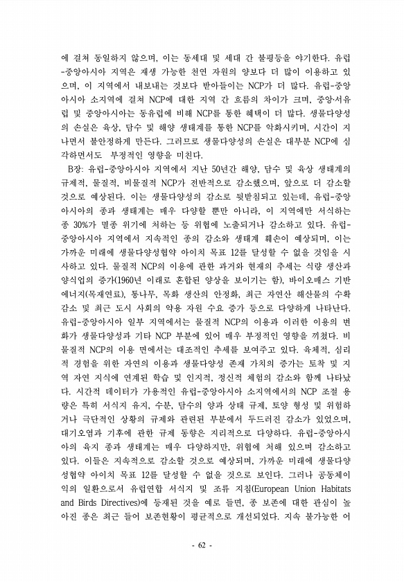 에 걸쳐 동일하지 않으며, 이는 동세대 및 세대 간 불평등을 야기한다. 유럽 -중앙아시아 지역은 재생 가능한 천연 자원의 양보다 더 많이 이용하고 있 으며, 이 지역에서 내보내는 것보다 받아들이는 NCP가 더 많다. 유럽-중앙 아시아 소지역에 걸쳐 NCP에 대한 지역 간 흐름의 차이가 크며, 중앙?서유 럽 및 중앙아시아는 동유럽에 비해 NCP를 통한 혜택이 더 많다. 생물다양성 의 손실은 육상, 담수 및 해양 생태계를 통한 NCP를 악화시키며, 시간이 지 나면서 불안정하게 만든다. 그러므로 생물다양성의 손실은 대부분 NCP에 심 각하면서도 부정적인 영향을 미친다. B장유럽-중앙아시아 지역에서 지난 50년간 해양, 담수 및 육상 생태계의 규제적, 물질적, 비물질적 NCP가 전반적으로 감소했으며, 앞으로 더 감...