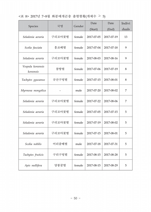 Species Gender Date Start Date End Indivi duals Seladonia aeraria ? female 2017-07-05 2017-07-19 13 Scolia fasciata female 2017-07-04 2017-07-18 9 Seladonia aeraria ? female 2017-08-03 2017-08-16 9 Vespula koreensis koreensis female 2017-07-06 2017-07-19 8 Tachytes gyusanus ? female 2017-07-15 2017-08-01 8 Myrmosa mongolica male 2017-07-20 2017-08-02 7 Seladonia aeraria ? female 2017-07-22 2017-08...