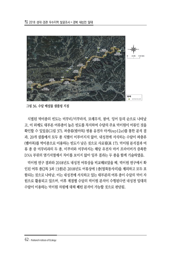 2018 생태·경관 우수지역 발굴조사 경북 내성천 일대 62 ? National Institute of Ecology 그림 36. 수달 배설물 샘플링 지점 식별된 먹이종의 빈도는 미꾸리/미꾸라지, 모래무지, 붕어, 잉어 등의 순으로 나타났 고, 이 외에도 대부분 어류종이 높은 빈도를 차지하여 수달의 주요 먹이원이 어류인 것을 확인할 수 있었음 그림 37 파충류 뱀아목 범용 유전자 마커 rep12sr 를 통한 분석 결 과, 20개 샘플에서 모두 종 식별이 이루어지지 않아, 내성천에 서식하는 수달이 파충류 뱀아목 를 먹이종으로 이용하는 빈도가 낮은 것으로 사료됨 표 17 먹이원 분석결과 어 류 종 중 미꾸리과의 두 종, 미꾸리와 미꾸라지는 해당 유전자 마커 프라이머가 증폭한 DNA 부위의 염기서열에서 차이를 보...