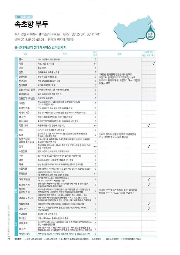 No. 속초- 본 생태자산의 생태계서비스 간이평가지 구분 예시 평가 등급 설명 규모별 혜택 지점 지역 국가 공급 담수 식수, 농업용수, 축산 용수 등 0 1932년 동해안의 안전한 대피항구로 개발되어 동해안의 대표적인 어항시설로 현재까지 유지되어 옴. 구항만 1.1km, 신항만 0.9km 규모 식량 곡물, 과실, 물고기 등 ++ √ 연료 화목, 토탄 0 섬유 건축용 목재, 의류용 섬유 등 0 유전자원 농업·축산업 희귀품종 등 0 천연약재 전통 의약품에 사용되는 식물 0 장식재료 수집용 조개껍질, 꽃 등 0 진흙,미네랄, 골재 건축용 모래 또는 자갈, 벽돌재료 진흙 등 0 폐기물처리 고체 쓰레기 하치, 폐수 방류 등 0 친환경에너지발전 조력발전, 풍력발전 0 조절 대기질 자동차 배기가스, 산업체 대기오염, 농...