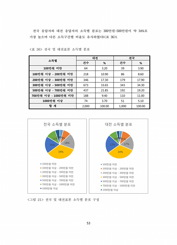 53 전국 응답자와 대전 응답자의 소득별 분포는 300만원500만원이 약 34%로 가장 높으며 다른 소득구간별 비율도 유사하였다 표 36 표 36 전국 및 대전표본 소득별 분포 소득별 대전 전국 건수 % 건수 % 100만원 미만 64 3.20 39 3.90 100만원 이상 200만원 미만 218 10.90 86 8.60 200만원 이상 300만원 미만 346 17.30 179 17.90 300만원 이상 500만원 미만 673 33.65 343 34.30 500만원 이상 700만원 미만 437 21.85 192 19.20 700만원 이상 1000만원 미만 188 9.40 110 11.00 1000만원 이상 74 3.70 51 5.10 합 계 2,000 100.00 1,000 100.00 그림 21 전국 및 대...