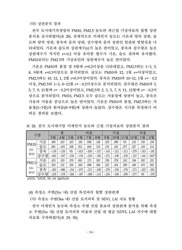 54 다 상관분석 결과 전국 도시대기측정망의 농도와 최근접 기상자료의 월별 상관 분석을 실시하였다 표 전체적으로 미세먼지 농도는 기온과 양의 상관 습 도와 양의 상관 풍속과 음의 상관 강수량과 음의 상관인 일관된 방향성을 나 타내었다 기온과 습도의 상관계수 가 높은 편이었고 풍속과 강수량은 높은 상관계수가 적지만 이상 유의한 월수가 기온 습도 결과와 유사했다 보다는 와 기상요인의 상관계수가 높은 편이었다 기온은 과 봄철 및 월에 이상을 나타내었고 와는 월에 이상으로 분석되었다 습도는 과 월 이상이었고 와는 월 이상이었다 풍속은 과 월 이상 와 월 이상으로 분석되었다 강수량은 과 월에 이상이었고 와 월에 이 상으로 분석되었다 모두 습도는 겨울철에 상관이 높고 풍속은 가을과 겨울을 중심으로 높은 편이었다 기온은...