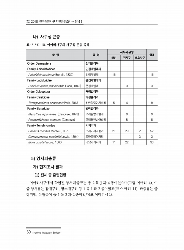 2018 전국해안사구 자연환경조사 전남Ⅰ 60 ? National Institute of Ecology 학 명 국 명 서식지 유형 합계 해빈 전사구 배후사구 Order Dermaptera 집게벌레목 Family Anisolabididae 민집게벌레과 Anisolabis maritima Bonelli, 1832 민집게벌레 16 16 Family Labiduridae 큰집게벌레과 Labidura riparia japonica de Haan, 1842 큰집게벌레 3 3 Order Coleoptera 딱정벌레목 Family Carabidae 딱정벌레과 Tetragonoderus sinanensis Park, 2013 신안알락먼지벌레 5 4 9 Family Elateridae 방아벌레과 Meristhus nipone...