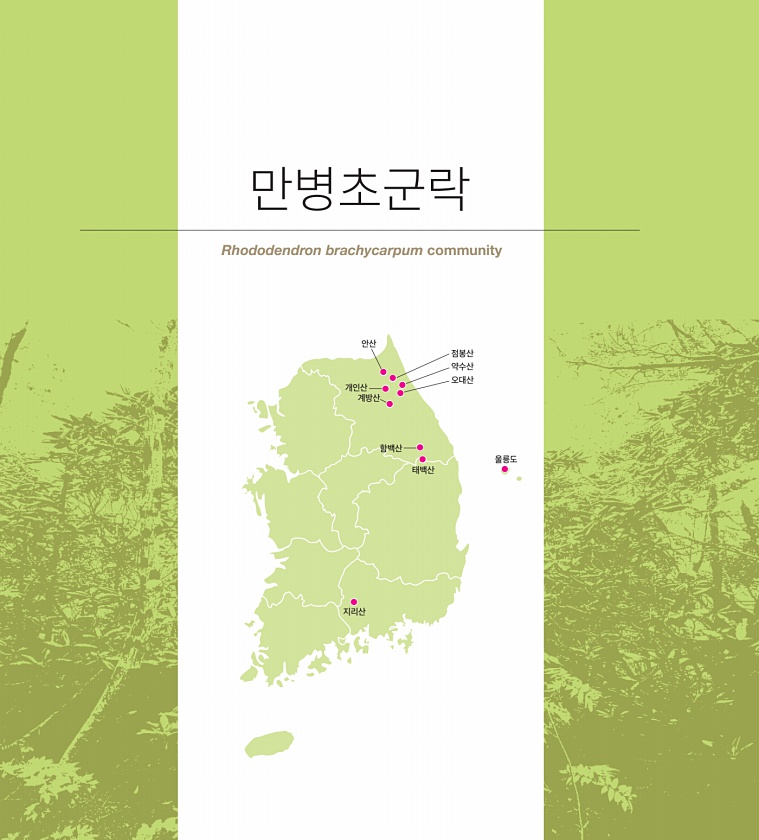 만병초군락 Rhododendron brachycarpum community 지리산 약수산 점봉산 오대산 함백산 계방산 개인산 안산 태백산 울릉도 ● ● ● ● ● ●● ● ●●