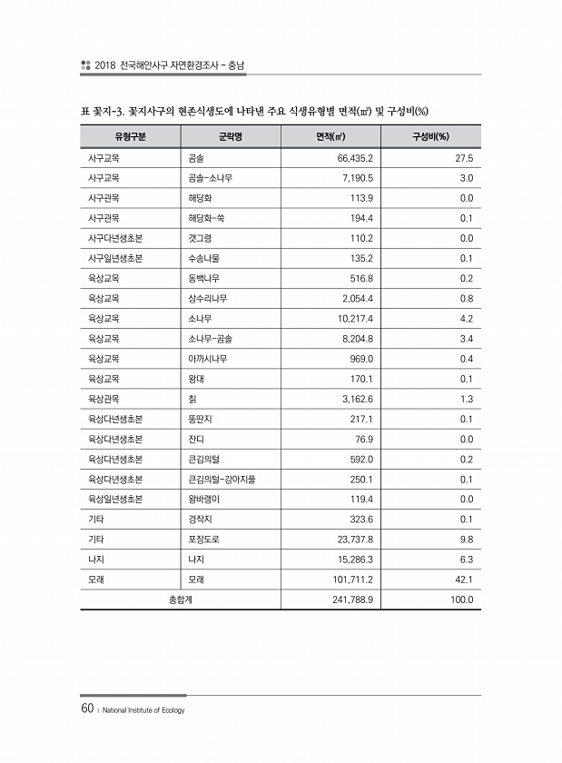2018 전국해안사구 자연환경조사 충남 60 ? National Institute of Ecology 유형구분 군락명 면적 ㎡ 구성비 % 사구교목 곰솔 66,435.2 27.5 사구교목 곰솔-소나무 7,190.5 3.0 사구관목 해당화 113.9 0.0 사구관목 해당화-쑥 194.4 0.1 사구다년생초본 갯그령 110.2 0.0 사구일년생초본 수송나물 135.2 0.1 육상교목 동백나무 516.8 0.2 육상교목 상수리나무 2,054.4 0.8 육상교목 소나무 10,217.4 4.2 육상교목 소나무-곰솔 8,204.8 3.4 육상교목 아까시나무 969.0 0.4 육상교목 왕대 170.1 0.1 육상관목 칡 3,162.6 1.3 육상다년생초본 뚱딴지 217.1 0.1 육상다년생초본 잔디 76.9 0.0 육상다...