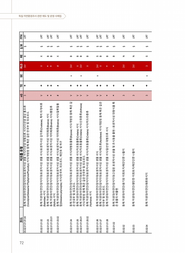 독일 자연환경조사 관련 제도 및 운영 사례집 코드 비오톱 유형 nG TE SE RLD RE § 30 FFH 05.02.01.01.01.04 동해 저생대/아연안/암석지대/표생저서성 생물 서식/다년생 대형조류 서식/다년생 엽상 홍조류 Coccotylus/Delesseria/ Phyllophora/Phycodrys 서식/개방된 동해 혹은 깊은 만곡부 및 피오르드 3 ? 3-V B § LRT 05.02.01.01.02 동해 저생대/아연안/암석지대/표생저서성 생물 서식/표생저서성 갑각류 Crustacea , 특히 따개비류 Balanidae 서식 V ? V X § LRT 05.02.01.01.03 동해 저생대/아연안/암석지대/표생저서성 생물 서식/표생저서성 이미패류 Bivalvia 서식 ? ? ? B § LRT 05....