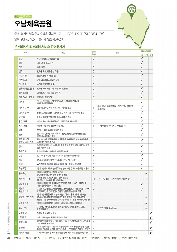 No. 남양주 남양주 030 본 생태자산의 생태계서비스 간이평가지 구분 예시 평가 등급 설명 규모별 혜택 지점 지역 국가 공급 담수 식수, 농업용수, 축산 용수 등 0 √ 식량 곡물, 과실, 물고기 등 0 √ 연료 화목, 토탄 0 √ 섬유 건축용 목재, 의류용 섬유 등 0 √ 유전자원 농업·축산업 희귀품종 등 0 √ 천연약재 전통 의약품에 사용되는 식물 0 √ 장식재료 수집용 조개껍질, 꽃 등 0 √ 진흙,미네랄, 골재 건축용 모래 또는 자갈, 벽돌재료 진흙 등 0 √ 폐기물처리 고체 쓰레기 하치, 폐수 방류 등 0 √ 친환경에너지발전 조력발전, 풍력발전 0 √ 조절 대기질 자동차 배기가스, 산업체 대기오염, 농업발생 먼지 등의 대기 미세물질의 제거 0 √ 지역적 기후 그늘, 대기온도 저하 등의 지역 미세기...