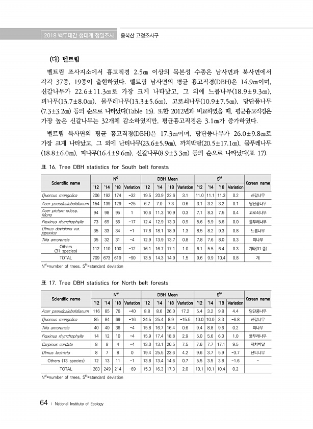 2018 백두대간 생태계 정밀조사 응복산 고정조사구 64 ? National Institute of Ecology 다 벨트림 벨트림 조사지소에서 흉고직경 2.5㎝ 이상의 목본성 수종은 남사면과 북사면에서 각각 37종, 19종이 출현하였다. 벨트림 남사면의 평균 흉고직경 DBH 은 14.9㎝이며, 신갈나무가 22.6±11.3㎝로 가장 크게 나타났고, 그 외에 느릅나무 18.9±9.3㎝ , 피나무 13.7±8.0㎝ , 물푸레나무 13.3±5.6㎝ , 고로쇠나무 10.9±7.5㎝ , 당단풍나무 7.3±3.2㎝ 등의 순으로 나타났다 Table 15 또한 2012년과 비교하였을 때, 평균흉고직경은 가장 높은 신갈나무는 32개체 감소하였지만, 평균흉고직경은 3.1㎝가 증가하였다. 벨트림 북사면의 평균 흉고직경 DBH ...