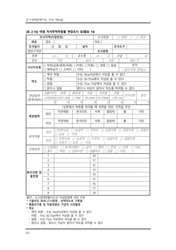 도시생태현황지도 작성 매뉴얼 62 조사지역 지점번호 조사방법 □ 정량 □ 정성 좌표 경도 위도 조사일시 년 월 일 날씨 조사도구 행정구역명 조사원명 하폭 m m 유수폭 m m 수심 ㎝ 온도 기온 00.0 ℃ 수온 00.0 ℃ 서식지유형 □ 하천 상류/중류/하류 □지류1 □지류2 □ 연못 □ 둠벙 □ 배후습지 □ 소택지 □ 기타 면적 정수지역 면적 ㎡ 탁도 □ 매우 탁함 수심 30㎝이상에서 저상을 볼 수 없다 □ 탁함 수심 30-75㎝에서 저상을 볼 수 있다 □ 맑음 수심 75㎝ 이상에서 저상을 볼 수 있다 □ 맑으나 얕음 맑으나 저상이 얕아서 탁도를 파악할 수 없다 하상입자 합계100% 진흙이하 모래 왕모래 자갈 작은돌 큰돌 콘크리트 암반 0.063㎜ 0.063-2㎜ 2-16㎜ 16-64㎜ 64-256㎜ 2...