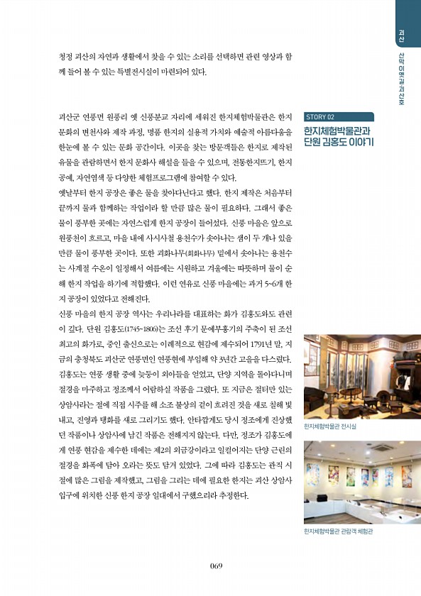 069 괴산 산 산 산 산 산 산산 산 산 청정 괴산의 자연과 생활에서 찾을 수 있는 소리를 선택하면 관련 영상과 함 께 들어 볼 수 있는 특별전시실이 마련되어 있다. 괴산군 연풍면 원풍리 옛 신풍분교 자리에 세워진 한지체험박물관은 한지 문화의 변천사와 제작 과정, 명품 한지의 실용적 가치와 예술적 아름다움을 한눈에 볼 수 있는 문화 공간이다. 이곳을 찾는 방문객들은 한지로 제작된 유물을 관람하면서 한지 문화사 해설을 들을 수 있으며, 전통한지뜨기, 한지 공예, 자연염색 등 다양한 체험프로그램에 참여할 수 있다. 옛날부터 한지 공장은 좋은 물을 찾아다닌다고 했다. 한지 제작은 처음부터 끝까지 물과 함께하는 작업이라 할 만큼 많은 물이 필요하다. 그래서 좋은 물이 풍부한 곳에는 자연스럽게 한지 공장이 들어섰다...