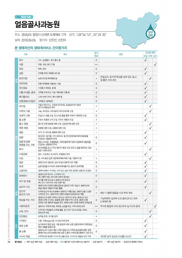 No. 밀양- 본 생태자산의 생태계서비스 간이평가지 구분 예시 평가 등급 설명 규모별 혜택 지점 지역 국가 공급 담수 식수, 농업용수, 축산 용수 등 0 √ 식량 곡물, 과실, 물고기 등 ++ √ 연료 화목, 토탄 0 √ 섬유 건축용 목재, 의류용 섬유 등 0 √ 유전자원 농업·축산업 희귀품종 등 + 큰일교차, 분지의 특성을 살린 당도 높고, 질 좋은 사과 생산 √ 천연약재 전통 의약품에 사용되는 식물 0 √ 장식재료 수집용 조개껍질, 꽃 등 0 √ 진흙,미네랄, 골재 건축용 모래 또는 자갈, 벽돌재료 진흙 등 0 √ 폐기물처리 고체 쓰레기 하치, 폐수 방류 등 0 √ 친환경에너지발전 조력발전, 풍력발전 0 √ 조절 대기질 자동차 배기가스, 산업체 대기오염, 농업발생 먼지 등의 대기 미세물질의 제거 + √ ...