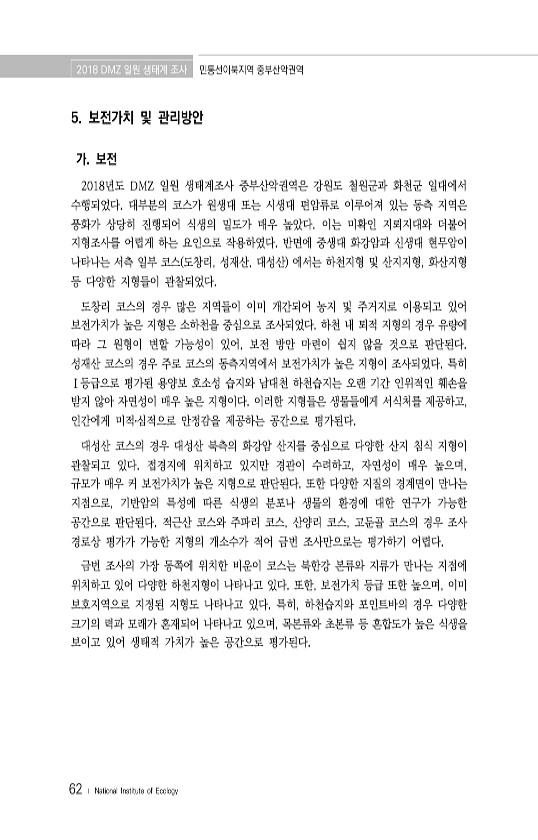 2018 DMZ 일원 생태계 조사 민통선이북지역 중부산악권역 62 ? National Institute of Ecology 5. 보전가치 및 관리방안 가. 보전 2018년도 DMZ 일원 생태계조사 중부산악권역은 강원도 철원군과 화천군 일대에서 수행되었다. 대부분의 코스가 원생대 또는 시생대 편암류로 이루어져 있는 동측 지역은 풍화가 상당히 진행되어 식생의 밀도가 매우 높았다. 이는 미확인 지뢰지대와 더불어 지형조사를 어렵게 하는 요인으로 작용하였다. 반면에 중생대 화강암과 신생대 현무암이 나타나는 서측 일부 코스 도창리, 성재산, 대성산 에서는 하천지형 및 산지지형, 화산지형 등 다양한 지형들이 관찰되었다. 도창리 코스의 경우 많은 지역들이 이미 개간되어 농지 및 주거지로 이용되고 있어 보전가치가 높은 지형...