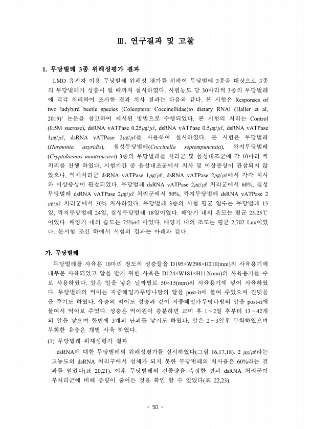 50 1. 3 LMO 3 3 30 3 Responses of two ladybird beetle species ColeopteraCoccinellidae to dietary RNAi Haller et al, 2019 ’ Control 0.5M sucrose , dsRNA vATPase 0.25㎍/㎕, dsRNA vATPase 0.5㎍/㎕, dsRNA vATPase 1㎍/㎕, dsRNA vATPase 2㎍/㎕ Harmonia axyridis , Coccinella septempunctata , Cryptolaemus montrouzieri 3 10 , dsRNA vATPase 1㎍/㎕, dsRNA vATPase 2㎍/㎕ dsRNA vATPase 2㎍/㎕ 60%, dsRNA vATPase 2㎍/㎕ 50%, ds...