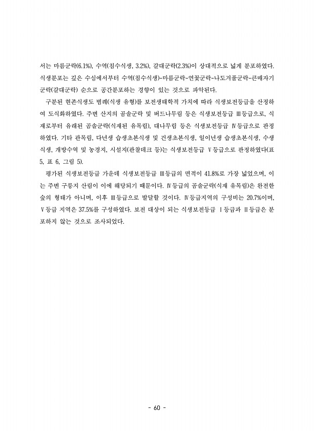 60 서는 마름군락 6.1% , 수역 침수식생, 3.2% , 갈대군락 2.3% 이 상대적으로 넓게 분포하였다. 식생분포는 깊은 수심에서부터 수역 침수식생 -마름군락-연꽃군락-나도겨풀군락-큰매자기 군락 갈대군락 순으로 공간분포하는 경향이 있는 것으로 파악된다. 구분된 현존식생도 범례 식생 유형 를 보전생태학적 가치에 따라 식생보전등급을 산정하 여 도식화하였다. 주변 산지의 곰솔군락 및 버드나무림 등은 식생보전등급 Ⅲ등급으로, 식 재로부터 유래된 곰솔군락 식재된 유목림 , 대나무림 등은 식생보전등급 Ⅳ등급으로 판정 하였다. 기타 관목림, 다년생 습생초본식생 및 건생초본식생, 일이년생 습생초본식생, 수생 식생, 개방수역 및 농경지, 시설지 관찰데크 등 는 식생보전등급 Ⅴ등급으로 판정하였다 표 5, 표 6, 그림 ...