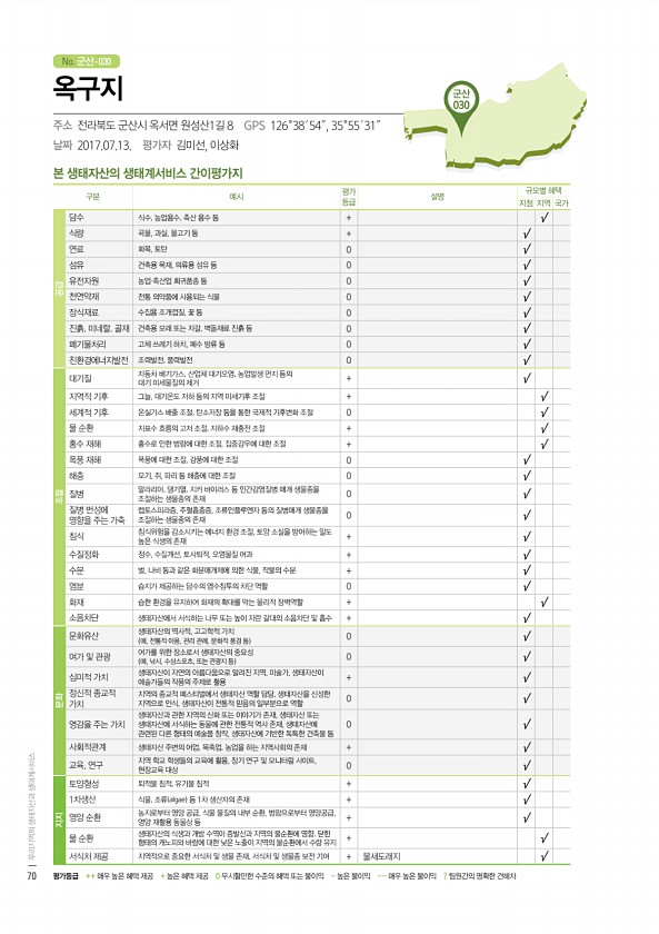 No. 군산- 군산 030 본 생태자산의 생태계서비스 간이평가지 구분 예시 평가 등급 설명 규모별 혜택 지점 지역 국가 공급 담수 식수, 농업용수, 축산 용수 등 + √ 식량 곡물, 과실, 물고기 등 + √ 연료 화목, 토탄 0 √ 섬유 건축용 목재, 의류용 섬유 등 0 √ 유전자원 농업·축산업 희귀품종 등 0 √ 천연약재 전통 의약품에 사용되는 식물 0 √ 장식재료 수집용 조개껍질, 꽃 등 0 √ 진흙, 미네랄, 골재 건축용 모래 또는 자갈, 벽돌재료 진흙 등 0 √ 폐기물처리 고체 쓰레기 하치, 폐수 방류 등 0 √ 친환경에너지발전 조력발전, 풍력발전 0 √ 조절 대기질 자동차 배기가스, 산업체 대기오염, 농업발생 먼지 등의 대기 미세물질의 제거 + √ 지역적 기후 그늘, 대기온도 저하 등의 지역 미세기...